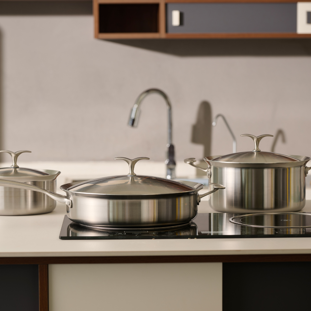 Our cookware is crafted from medical-/food-grade 316/304 stainless steel, multi-ply clad steel (5-ply+), high-purity cast iron, and aerospace-grade aluminum alloy. Coatings use certified Swiss/German/Korean non-stick technology or coating-free physical non-stick. All materials meet FDA/SGS/LFGB standards and offer even heating, strong heat retention, durability, and safe performance.