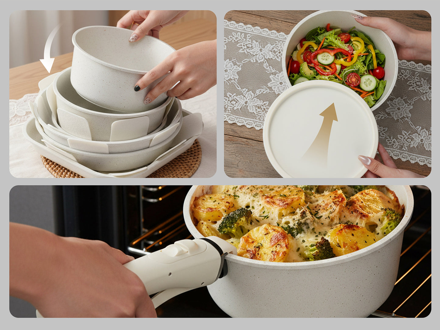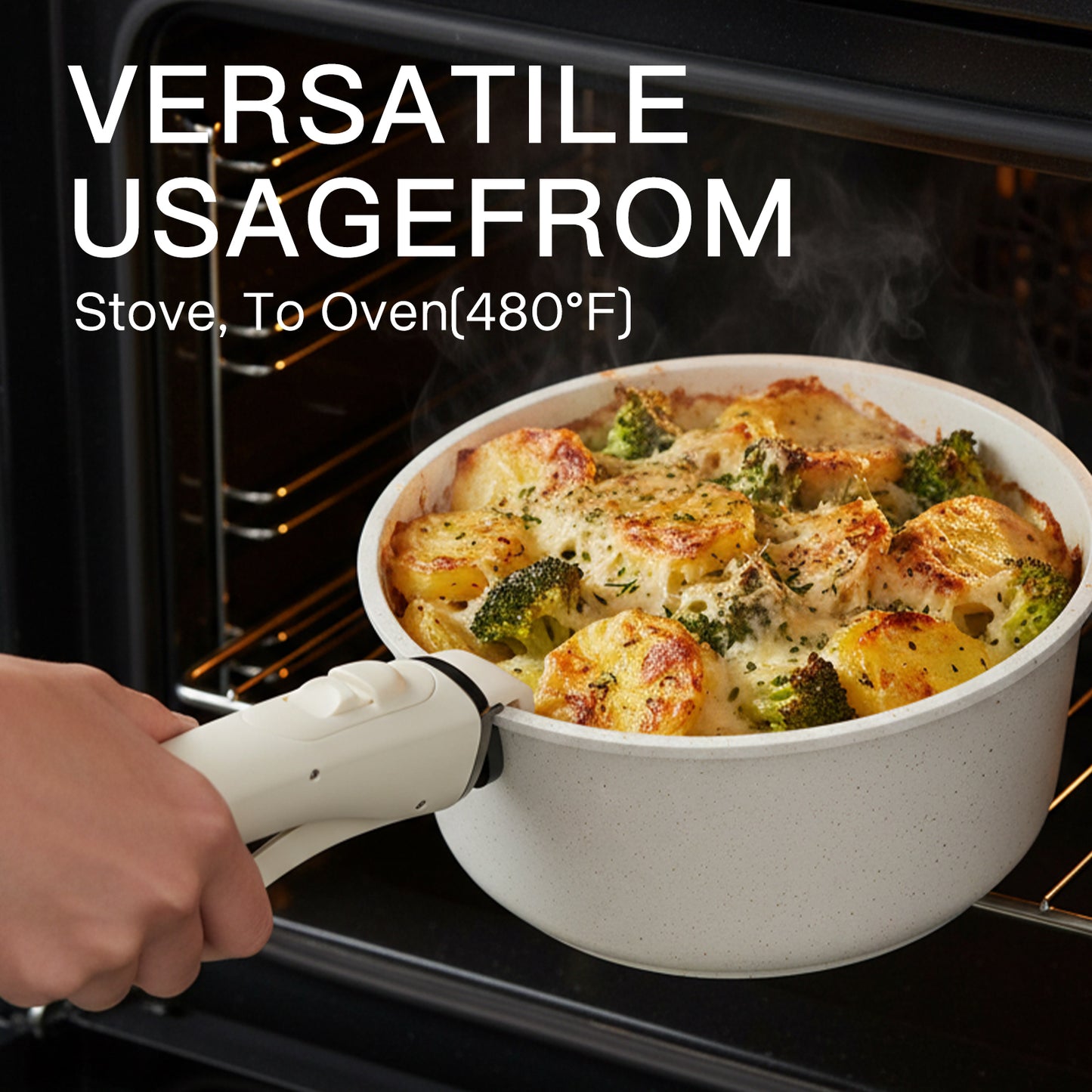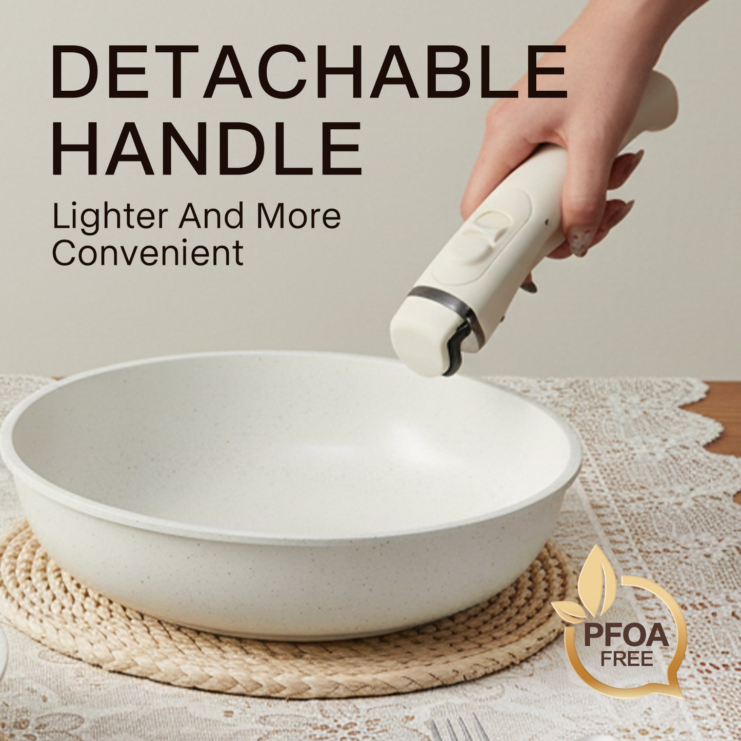 Detachable handle cookware: Useluck detachable handle pots and pans feature a double-lock for safety;Remove the handle to prevent overheating;Our removable handle pots and pans switch easily between stove, oven, grill, fridge, and table
