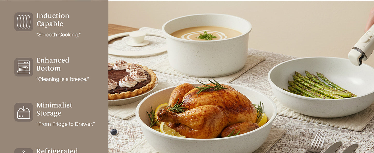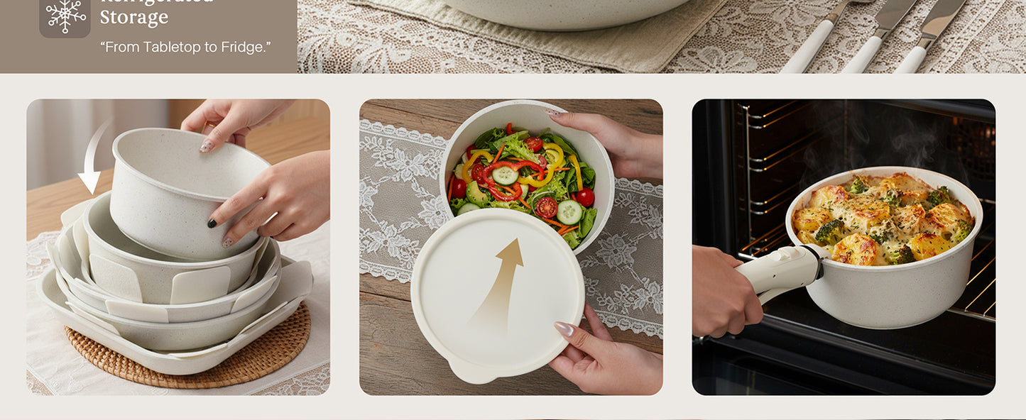 Universal Stove Compatibility: This induction cookware pan set works with all stoves, including induction, gas, electric, and ceramic;Oven-safe up to 550°F, silicone lids up to 350°F, and sealable lids from -100°F to 170°F