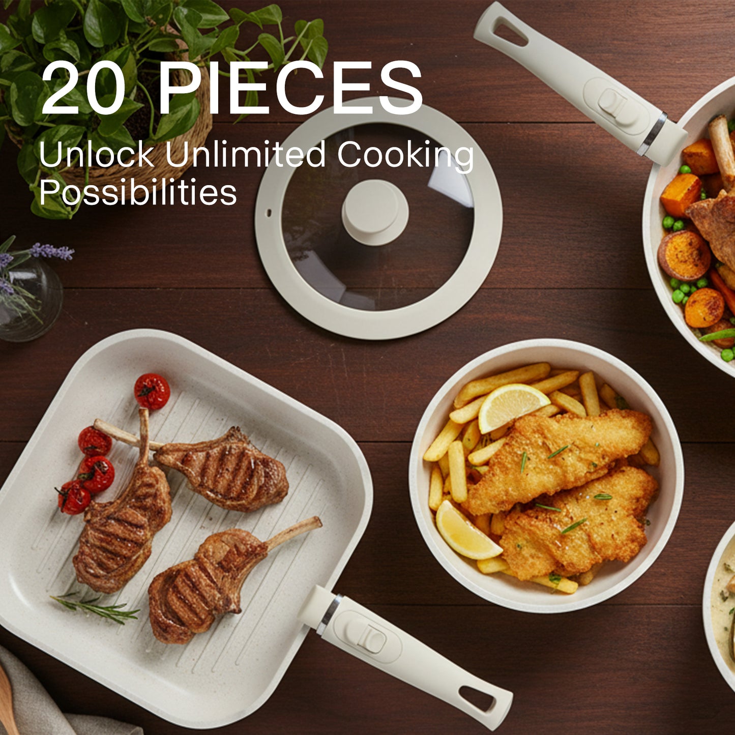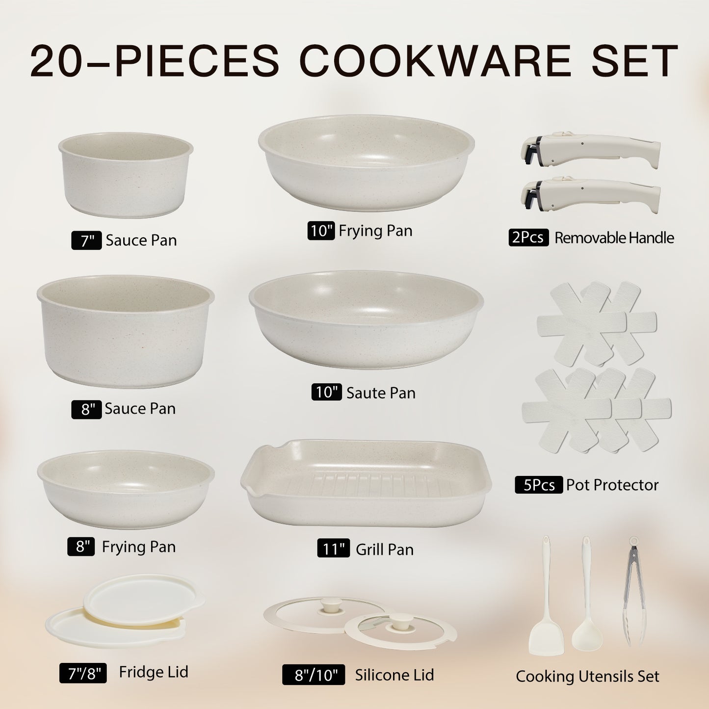 USELUCK 20 Pcs pots and pans set non stick, Oven Safe, Stackable pots and pans with removable handles, Healthy RV Set with Detachable Handle, Cream White