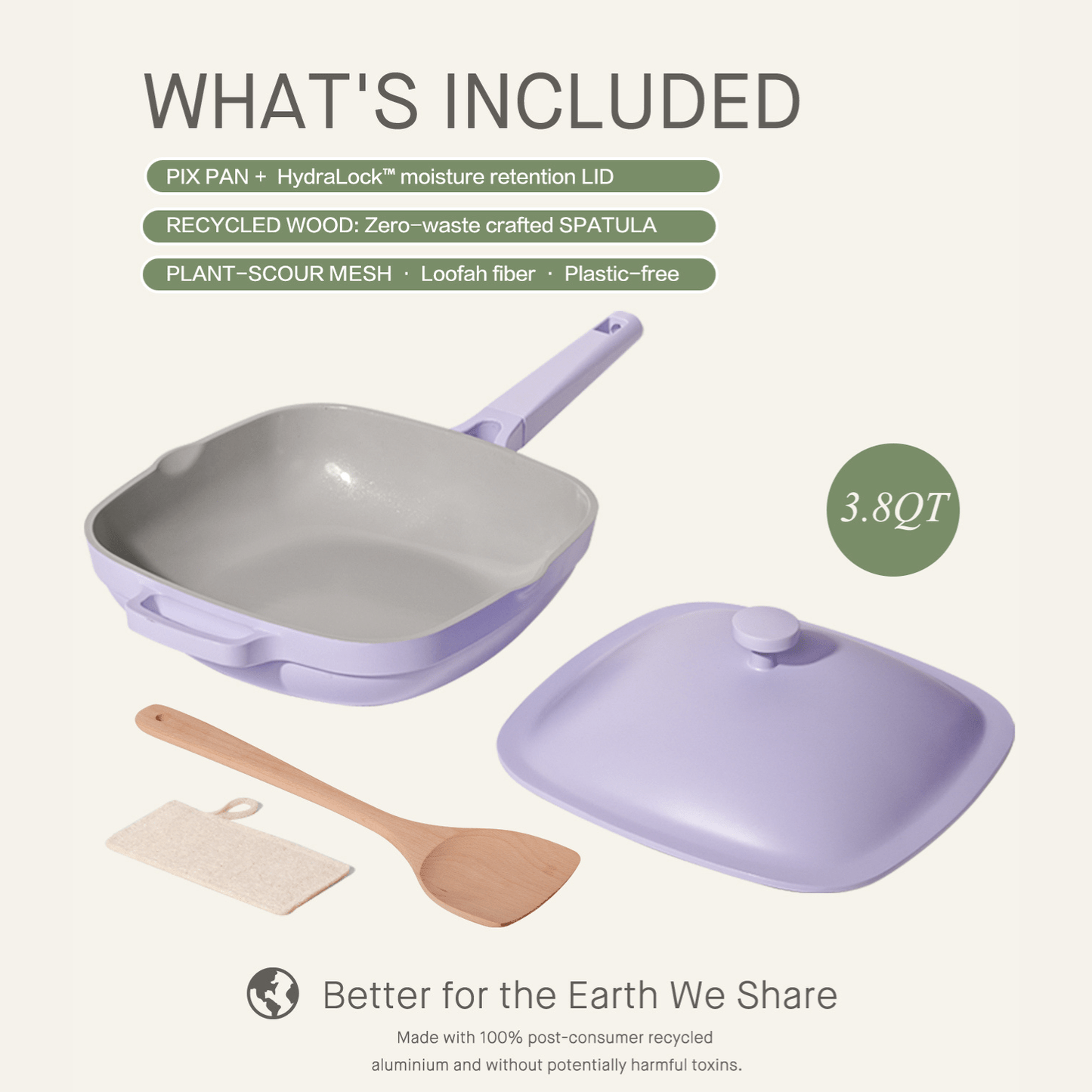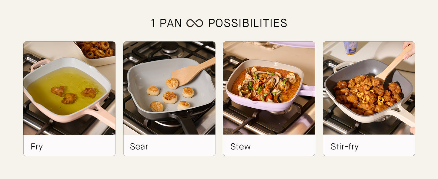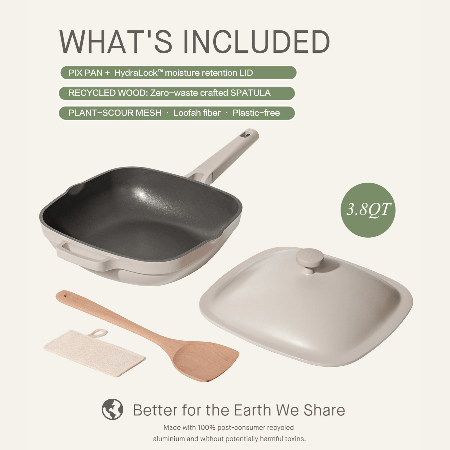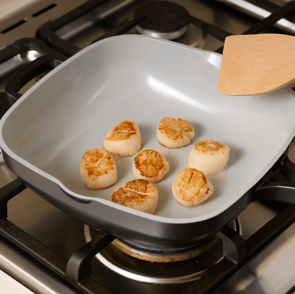 Our Pix square pan offers 35–45% more cooking surface than standard round pans, letting you sear, sauté, braise, stir-fry, and more — all in one versatile piece. Replacing your frying pan, saucepan, wok, braiser, sauté pan, nonstick pan, and even stock pot, it’s perfect for cooking multiple portions without overcrowding. Ideal for families, meal prep, and anyone who loves efficiency in the kitchen.
