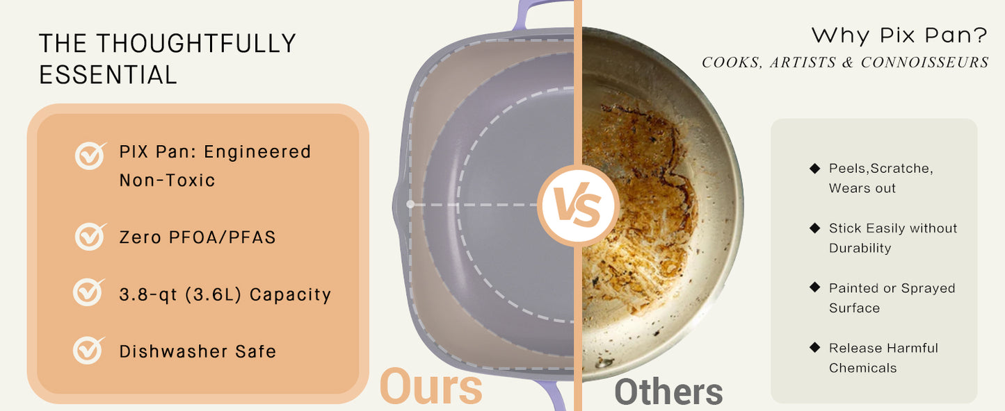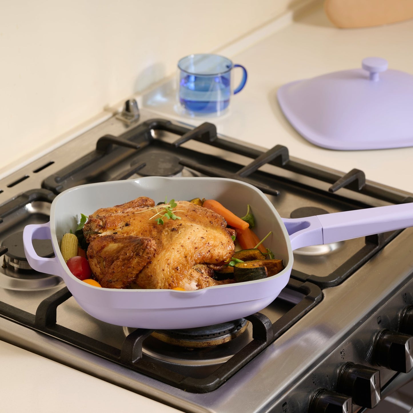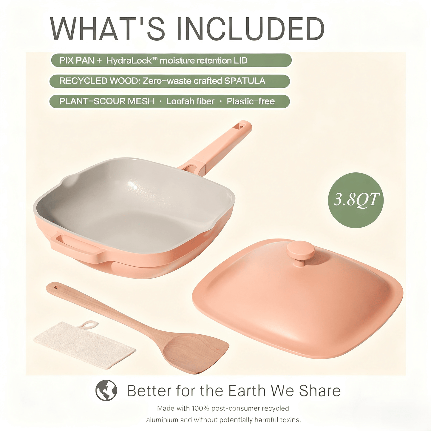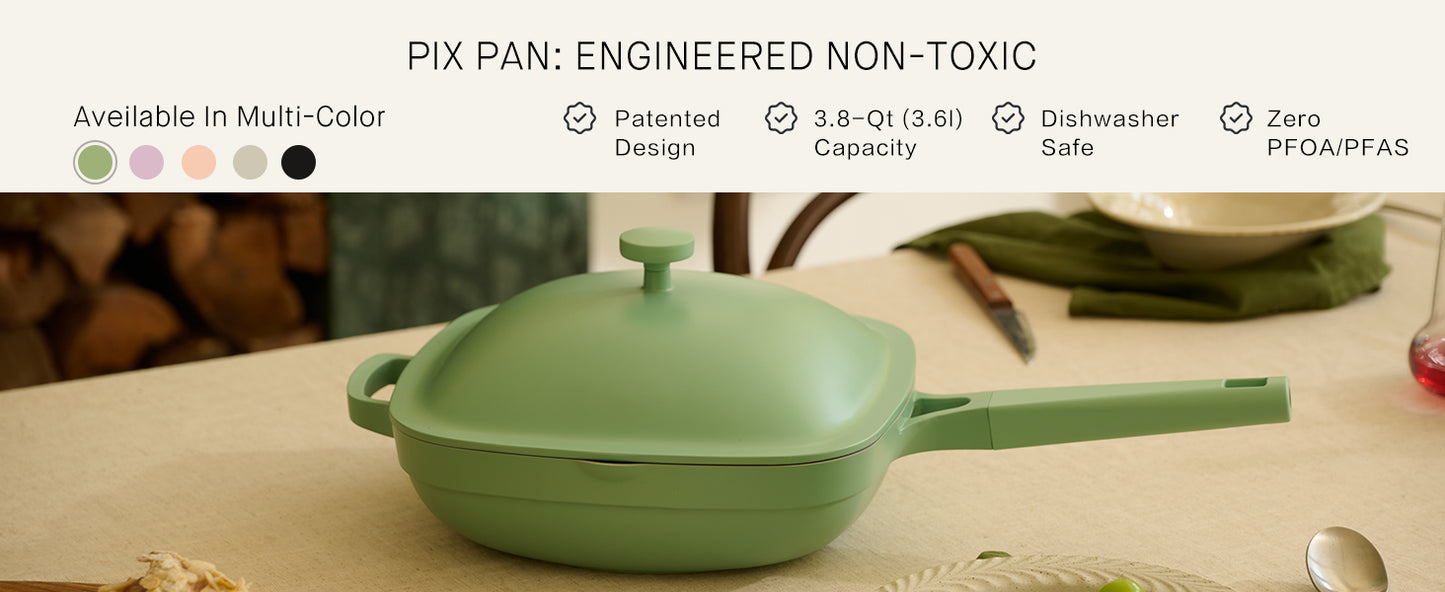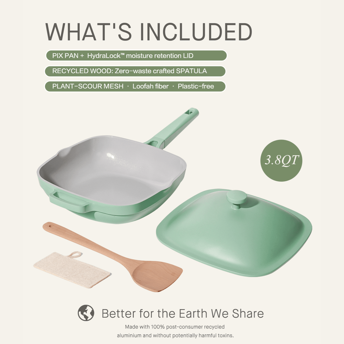 Our Pix square pan offers 35–45% more cooking surface than standard round pans, letting you sear, sauté, braise, stir-fry, and more — all in one versatile piece. Replacing your frying pan, saucepan, wok, braiser, sauté pan, nonstick pan, and even stock pot, it’s perfect for cooking multiple portions without overcrowding. Ideal for families, meal prep, and anyone who loves efficiency in the kitchen.